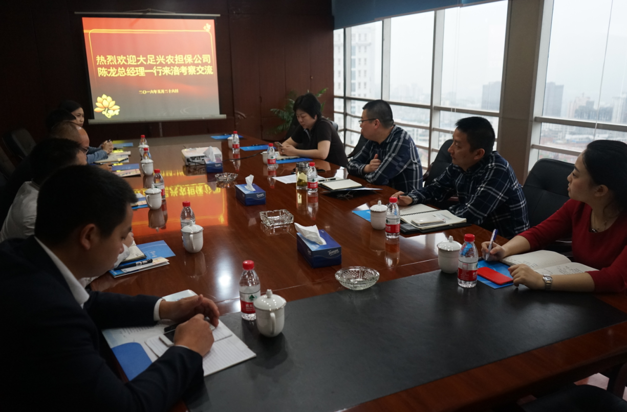 2016年5月26日,best365英国官网与到访的大足兴农担保公司陈龙总经理一行进行座谈。谢晖总经理介绍了best365英国官网的运营发展情况。随后,双方就公司业务合作、风险控制、内部管理和农业项目开发等方面进行了深入的交流讨论,取得了良好的效果。