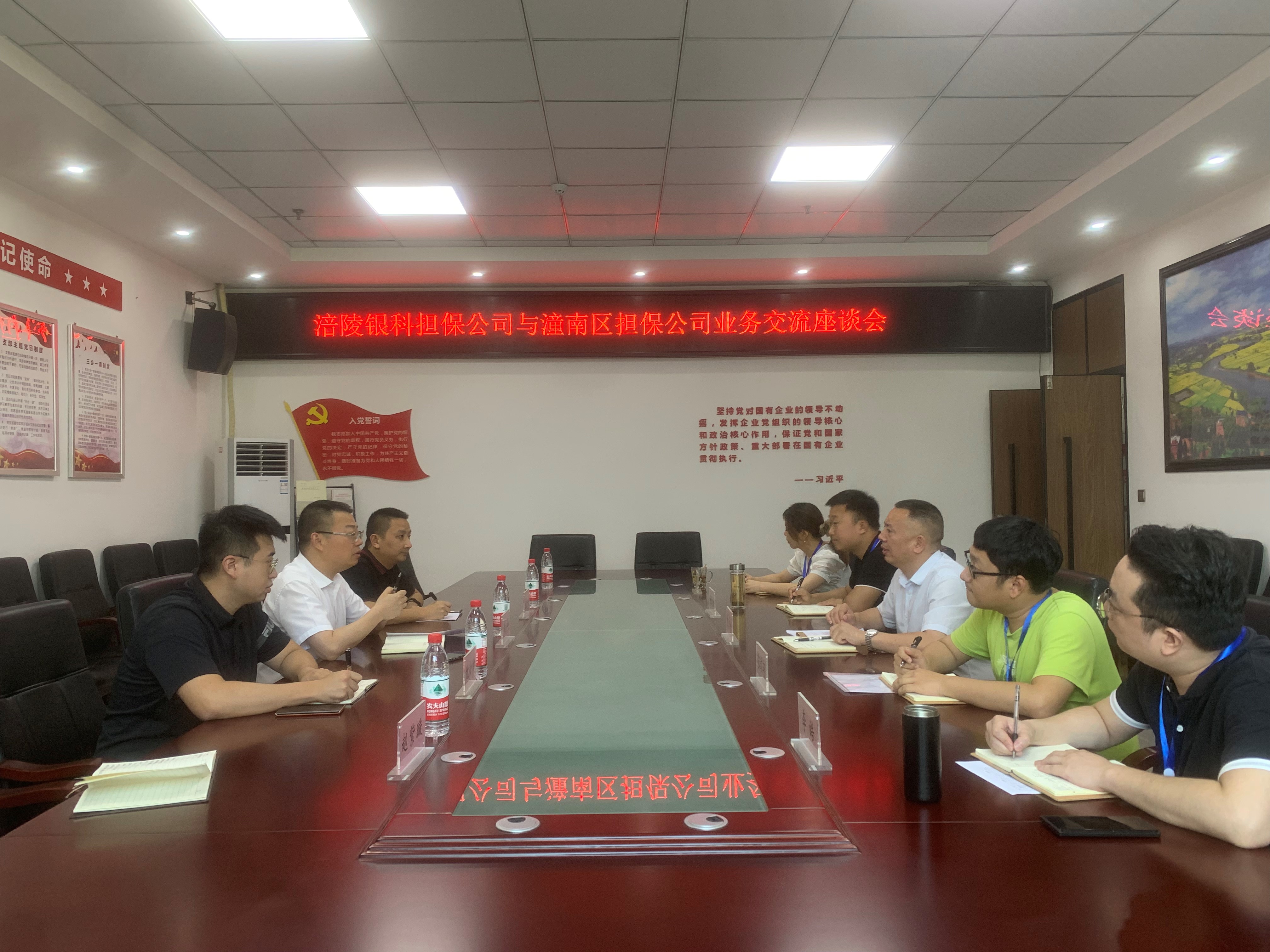 2021年7月27日,公司董事长谢晖、副总经理胡欢带领相关部门员工前往潼南兴农担保公司进行交流学习,双方就业务拓展、风险控制及人力资源管理等方面进行了深入探讨。