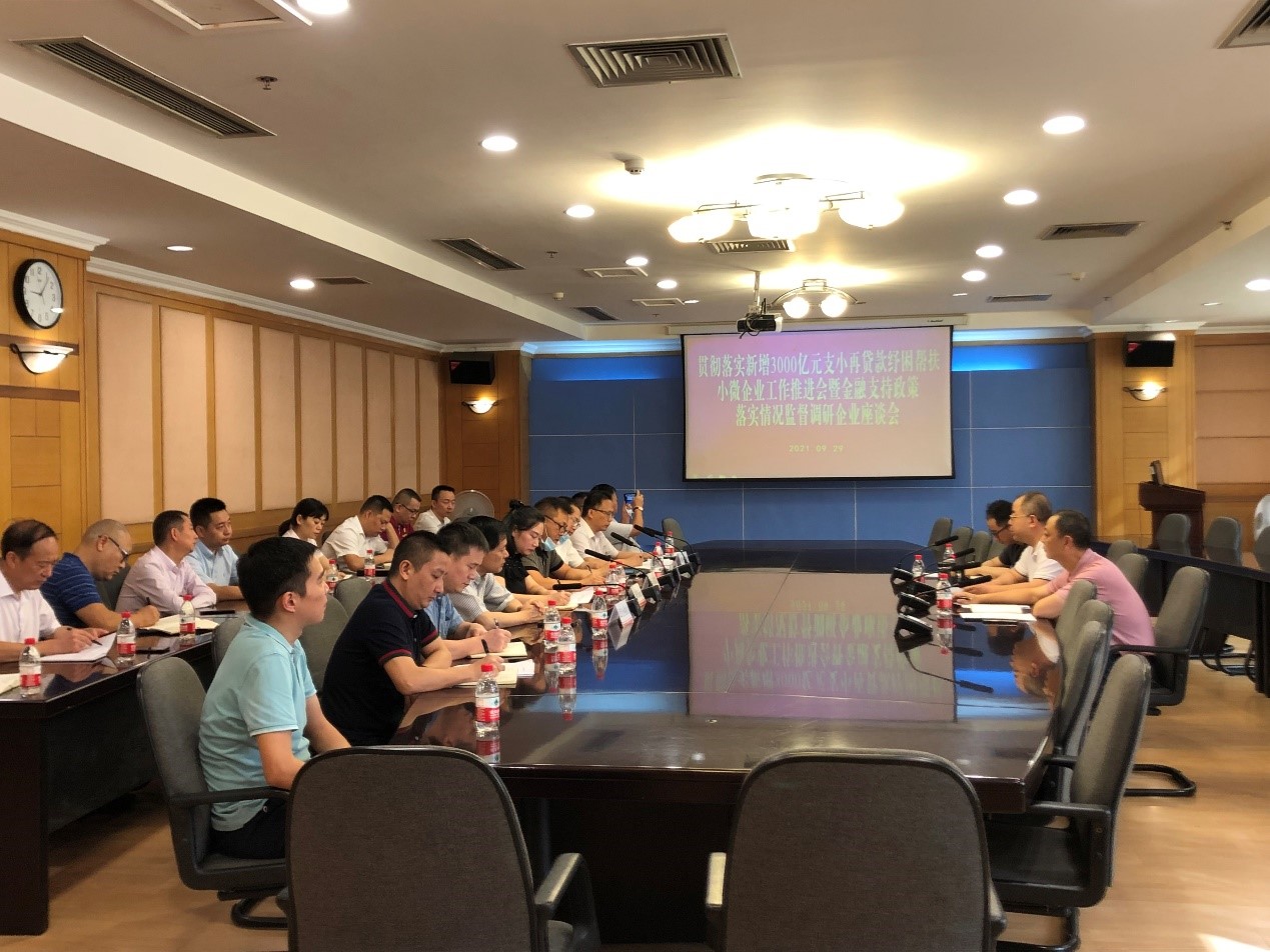2021年9月29日上午,公司副总经理胡欢、担保业务部经理王正参加了由人民银行涪陵中心支行组织召开的“贯彻落实新增3000亿元支小再贷款纾困帮扶小微企业工作推进会暨金融支持政策落实情况监督调研企业座谈会”。会上,农商行、重庆银行、三峡银行、中银富登、担保公司等金融机构与涪陵区民营企业协会代表就如何为区内小微企业提供优质金融服务、配套金融产品、落地5.6亿元再贷款等问题进行了深入交流。